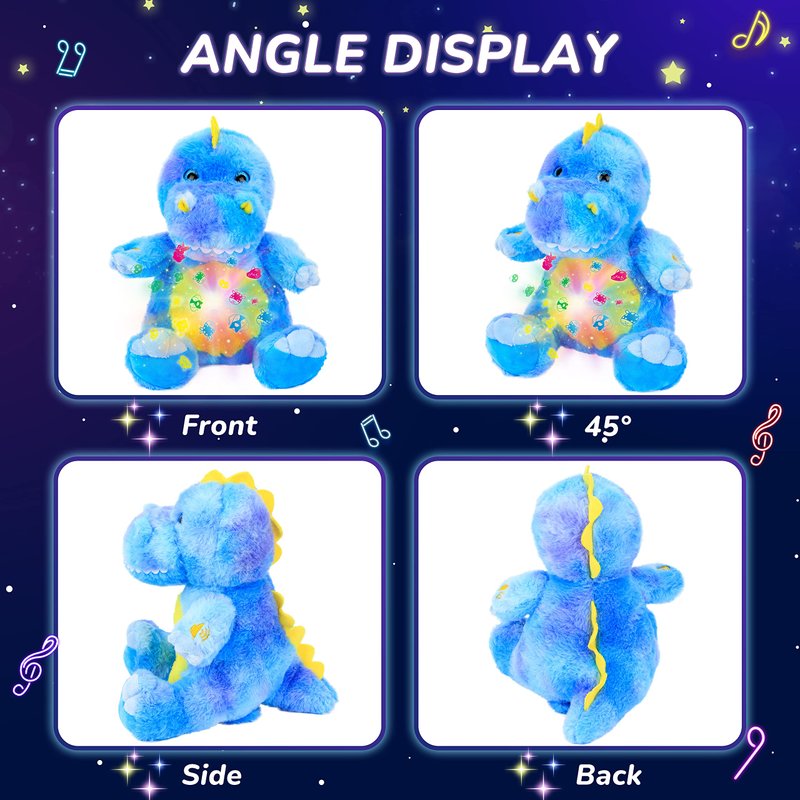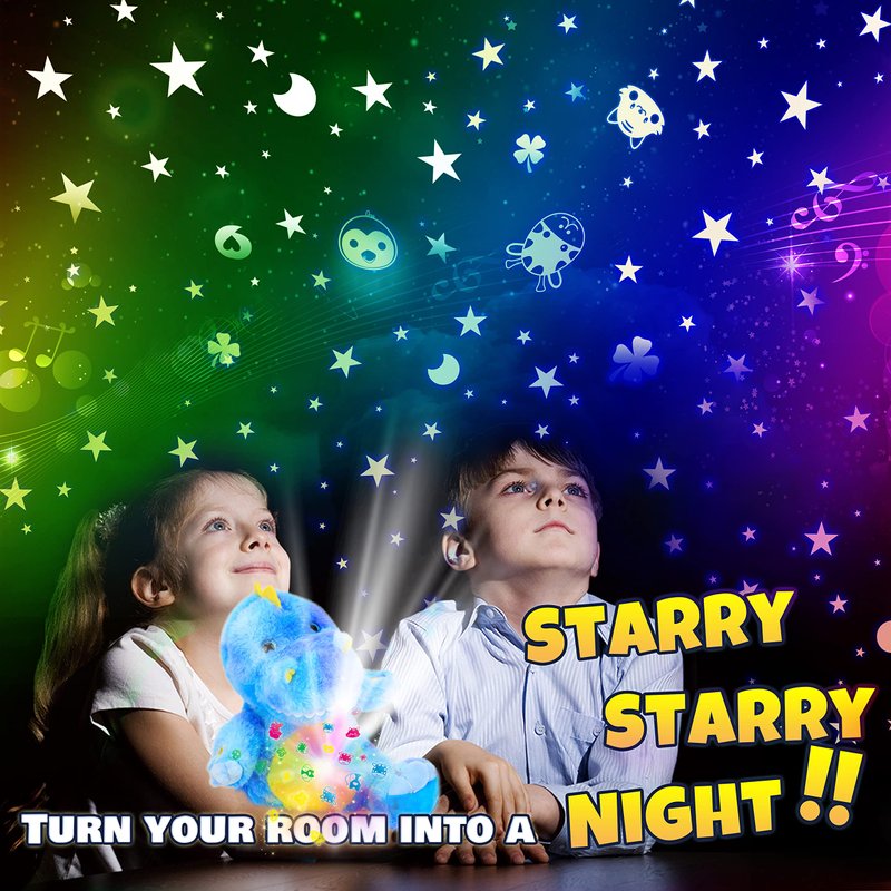 - Nightlight Star Projector: A star projector designed for dinosaur lovers! This cute dinosaur plush toy has an tummy and is designed for children's bedrooms with soft lighting that projects stars and the moon. Features color-changing projections and instrumental lullabies.