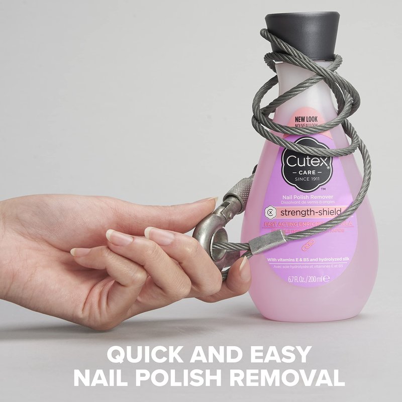 - CONTAINS CARING INGRIDIENTS: Cutex Strength-Shield nail polish remover is enriched with hydrolyzed silk, vitamin E and vitamin B5