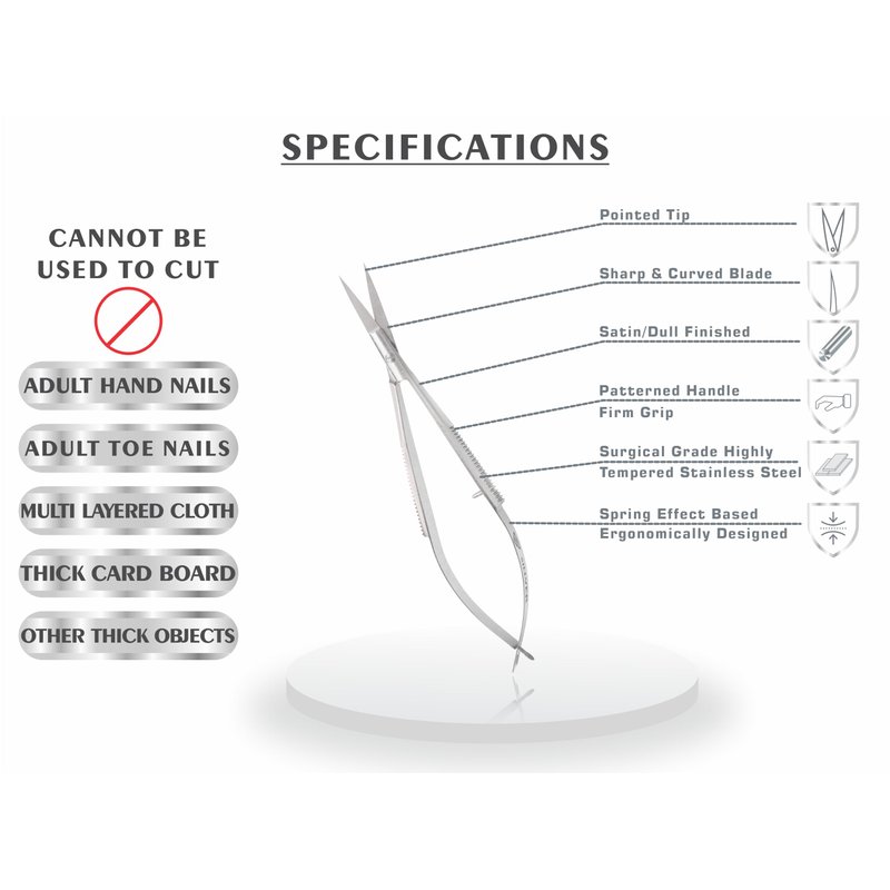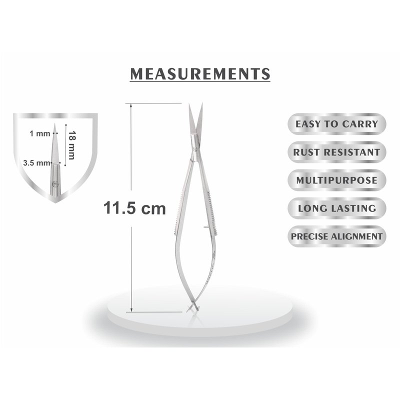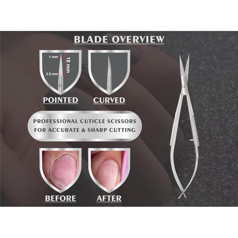 - Well Made - High quality cuticle scissors are made of Professional surgical grade stainless steel, lightweight and delicate, strong and rust-proof, super sharp to remove dead skin with breeze and painlessly, extremely precise to clip very cleanly, leaving no hang nails behind. Curved Design makes the cuticle scissors more precise by any angles and shapes. The extra fine blades cut cleanly in any direction to improve safety and efficiency.