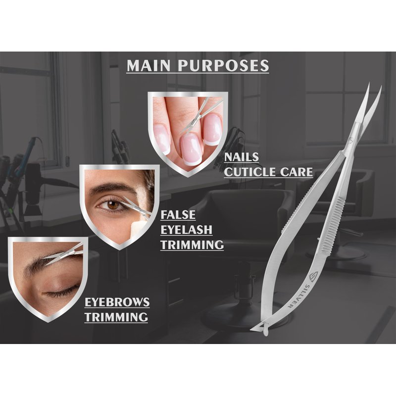 SILLVER unique design spring action cuticle scissors with extra fine curved blades are made of professional surgical grade stainless steel, lightweight and delicate, which is strong and really rust-proof, super sharp to remove dead skin with breeze and painlessly, extremely precise to clip very cleanly, leaving no hang nails behind; High quality stainless steel and advanced technology ensuring long-lasting blades razor sharpness and precision. Our professional grroming scissors are great for grown cuticles or hang nails, super dry, rough, uneven cuticles, and are multi purpose for eyelashes and eyebrows, detangling matted fur of pet.This embroidery sewing scissor features with non-slip handle and pointed tip, which can nicely add to your sewing tool kit, bringing much convenience for you. This cutting scissor is suitable for embroidery, sewing, crafting, or even for home use. Also can be applied for facial and eyebrow trimming. These nail care scissors and cuticle scissors can become very good part of your beard kit, mustache kit, nail kit, nail tools, pedicure tools, facial kit for women, eyelash kit, grooming kit, eyebrow kit, beard grooming kit, nail set, manicure kit and manicure tools, personal care products.