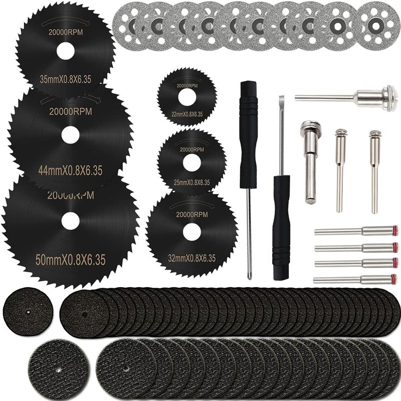- GOOD VARIETY AND NUMBER OF CUTTING WHEELS - With 36pcs cutting wheels, 20pcs resin cut-off discs, 6pcs HSS circular saw blades, 10pcs diamond cutting wheels, 8pcs mandrels, and even included screwdrivers, this Cutting Discs Set is a perfect addition to your accessories for a rotary tool. Any hobbyists would do well to add this to their toolbox.