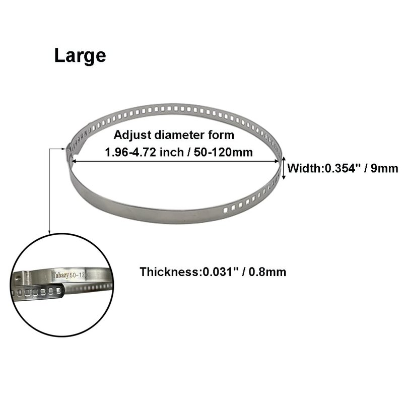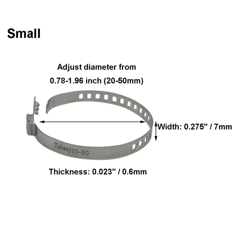 - THE SIZE OF CRIMP BANDS: Small- Adjust diameter from 0.78-1.96 inch(20-50mm), 0.275" (7mm) in width & 0.023" (0.6mm) in thickness, Large-Adjust diameter from 1.96-4.72 inch(50-120mm), 0.354" (9mm) in width & 0.031" (0.8mm) in thickness.