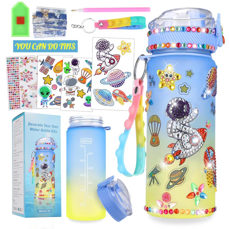 - 🚀【Diamond Art DIY Water Bottle】Kids Water Bottle, 600ml capacity, features astronauts and space elements that kids adore. The vibrant and sparkly diamond stickers included add a glamorous touch, our cartoon stickers are not temporary tattoos; they are scratch-resistant, wear-resistant, allowing children to enjoy designing their own unique water bottles and inspiring creativity and hands-on skills.