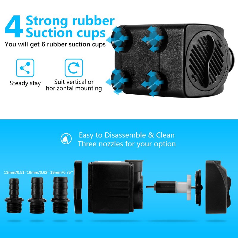 - ★【COMPACT BUT POWERFUL】The fountain pump’s compact design is easy to hide & disguise, 25W super efficiency motor continually lift water column. Reasonable long power cord is heavy duty and easy to installation. The pump has 4 strong rubber suction cups at the bottom of the fountain pump helps keep in your fish tank.