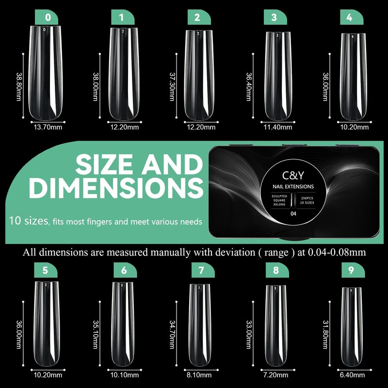 C&Y Nail Natural Sculpted Square XX long Box of 250 Gel Acrylic Nail Tips,10 Sizes for Full Cover Nail Extension Home DIY Nail Salon