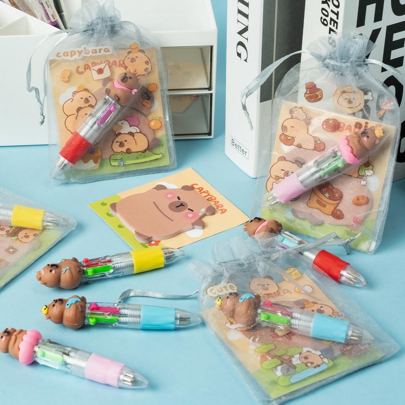 With 12pcs 4-in-1 mini ballpoint pens, 12pcs capybara shape sticky notes, 12pcs cute cartoon animal stickers and 12pcs organza bag included in the set, it offers great value for its price.