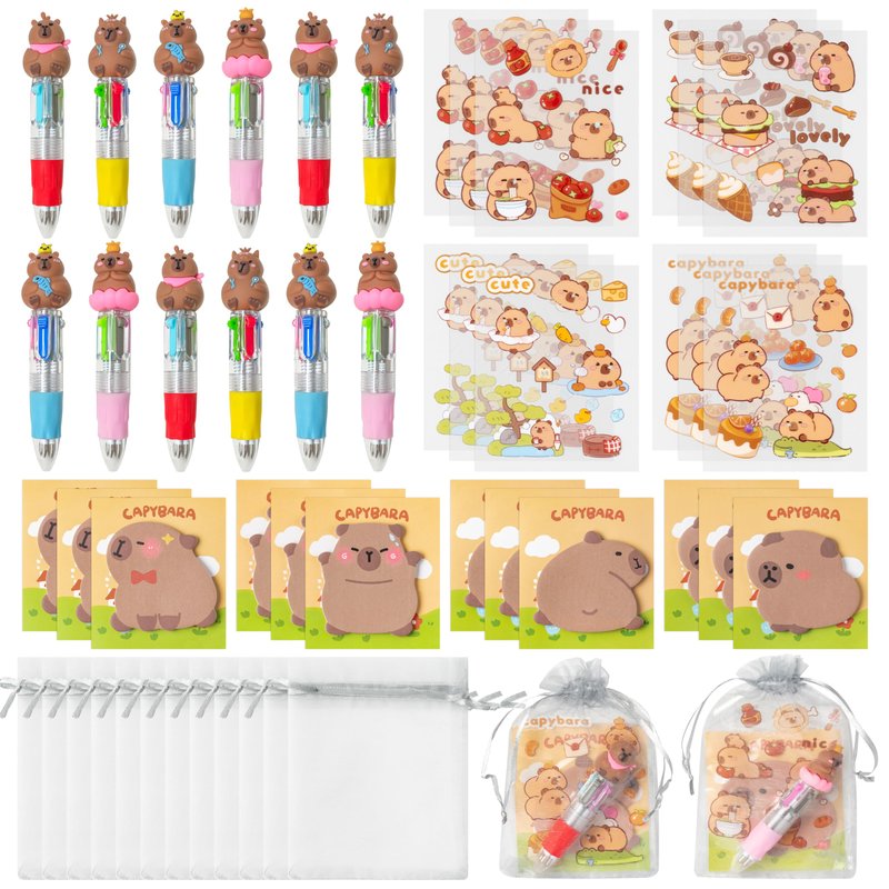 CY2SIDE Capybara Stationery Party Gift - 36PCS Capybara Stationery Gifts Set Include 4-in-1 Ballpoint Pens Sticky Notes Stickers and Organza Capybara Party Favors Goodie Bag Fillers for School Rewards