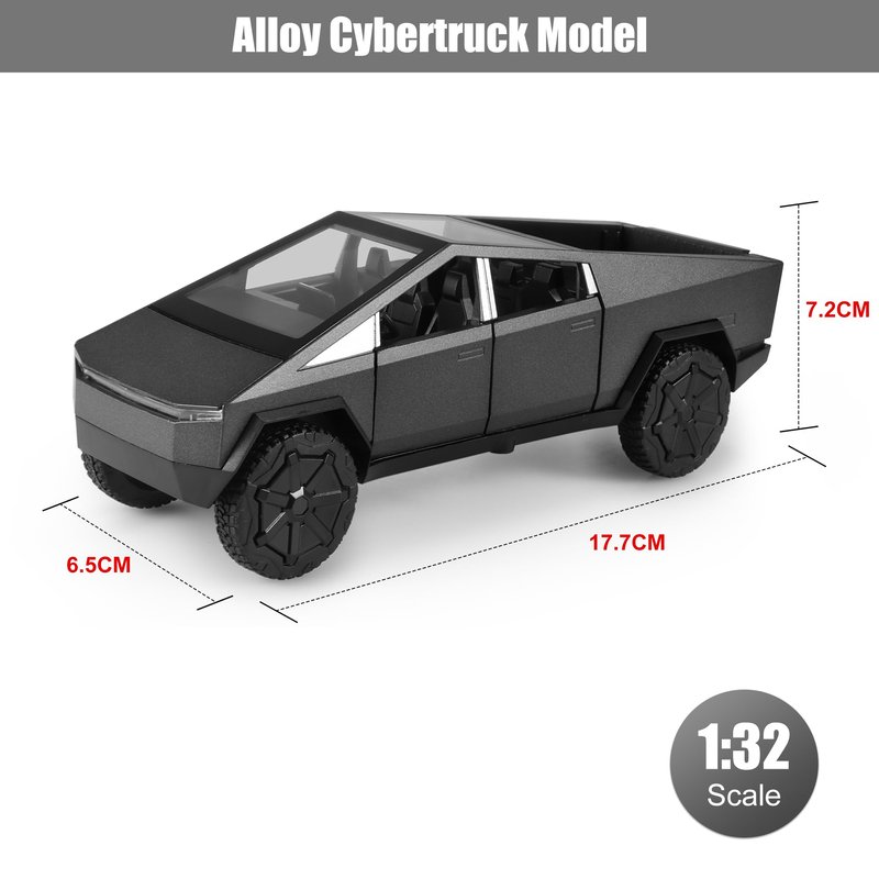 - Cybertruck Toy: 1/32 Cybertruck metal diecast model measures 7.0" X 2.5" X 2.8". This Cybertruck toy is crafted with realistic details of the real Cybertruck vehicle, a metal body with plastic parts, rubber tires, and detailed interior and exterior trim.