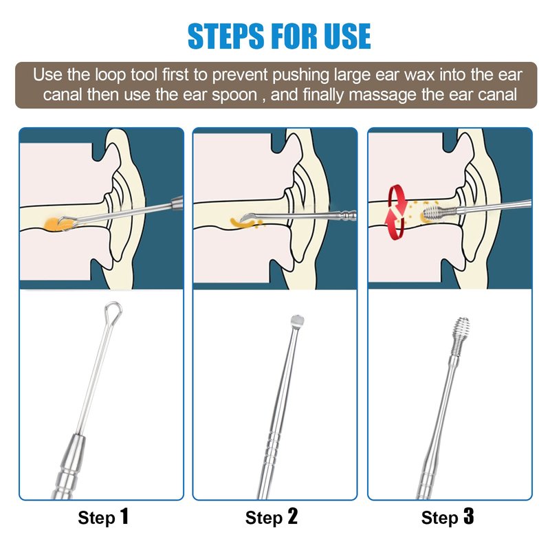 - 【EASY TO CLEAN】: The earwax removal kit is of all steel construction, can be rinsed thoroughly with soap and water. Then disinfect these ear picks with rubbing alcohol.