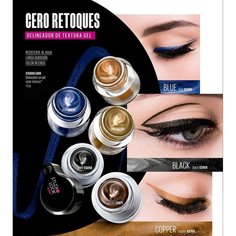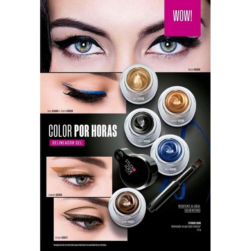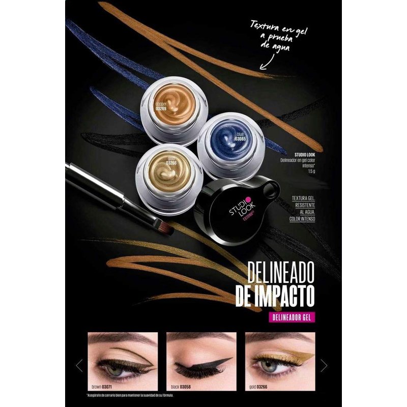 El delineador en gel de color intenso Studio Look bastará para impresionar con tu mirada. Y es que este delineador en gel es lo que buscábamos porque es de larga duración (hasta 13 horas según pruebas hechas en laboratorios Efisein). ¿Te imaginas salir de casa en la mañana y mantener el delineado cuando regresas en la noche? Como si nuestros deseos se hubieran hecho realidad. Otra cosa buenísima de este delineador en gel es que es resistente al agua. No es que vayamos a llorar por un chico ni nada, pero si vemos una película romántica y nos emocionamos de más, no hay problema porque nuestro maquillaje no se arruinará. Por otro lado, el delineador viene en cinco tonos con colores intensos y textura en gel. Lo que quiere decir que la aplicación será mucho más simple de lo que imaginas y puedes conseguir un resultado variado de acuerdo a los tonos que elijas para tu look. Cuando uses el delineador recuerda taparlo inmediatamente después, ya que puede secarse. Por otro lado, te recomendamos limpiar el aplicador con una toallita limpiadora o desmaquillador. De esta forma el aplicado quedará como nuevo después de cada uso.
