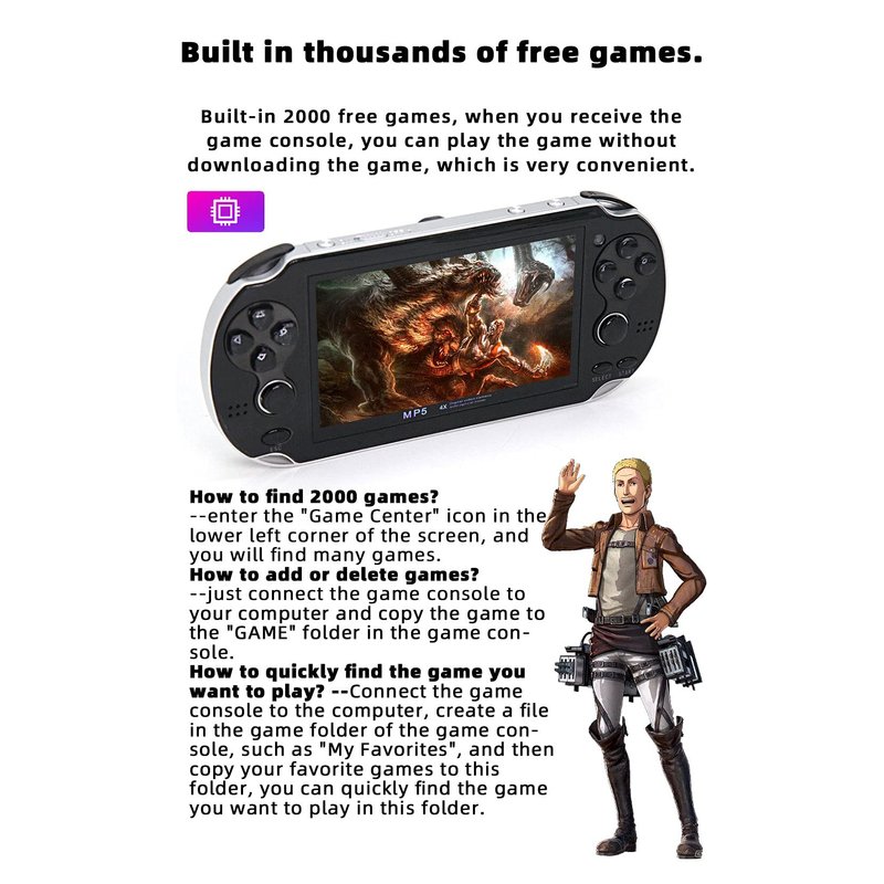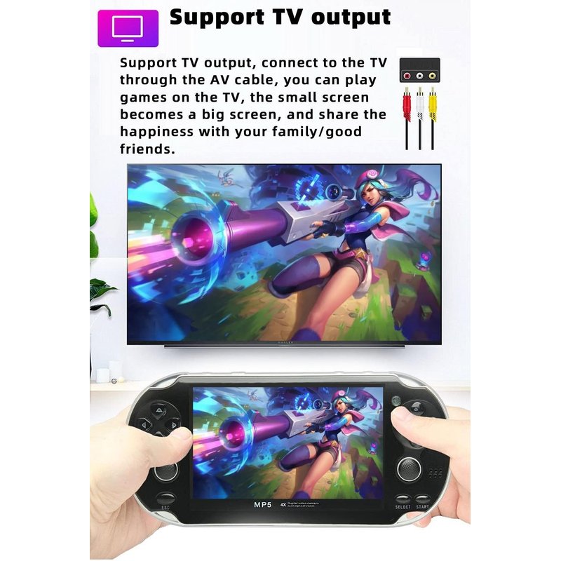 - ※Support TV output function※.the game console can be connected to the TV through an AV cable to play games,watch movies on the TV. Make the small screen bigger and share happiness with your family/friends.