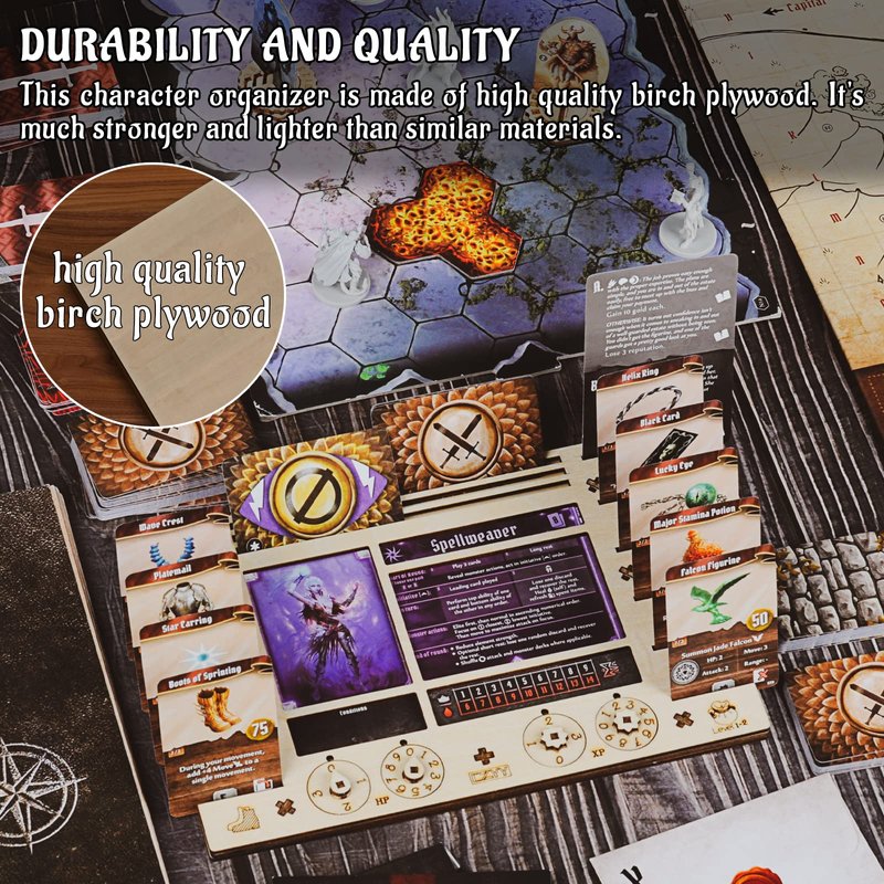 - DURABILITY AND QUALITY - This character organizer is made of high quality birch plywood. It's much stronger and lighter than similar materials. Character boards can be inserted into the middle layer of this player dashboard.