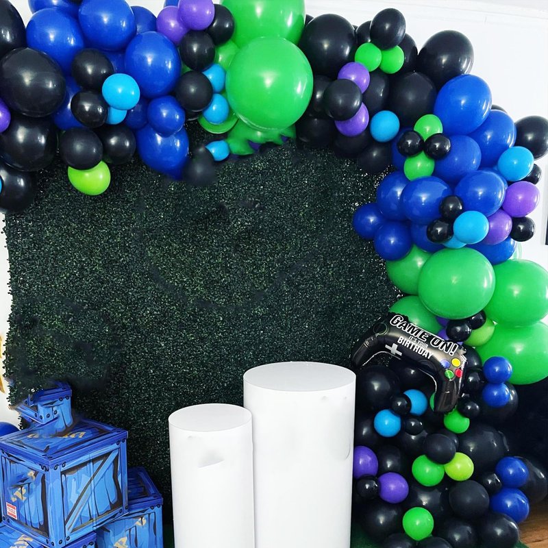 - Game Balloons Set : Three different sizes, 5 inch, 10 inch, 18 inch,green balloon, black balloon,tiffany blue balloon, purple balloon,1 roll of dispersing strip, 17 ft double hole balloon chain, 1 Blue 33 ft long ribbons, 1 balloon tool tie