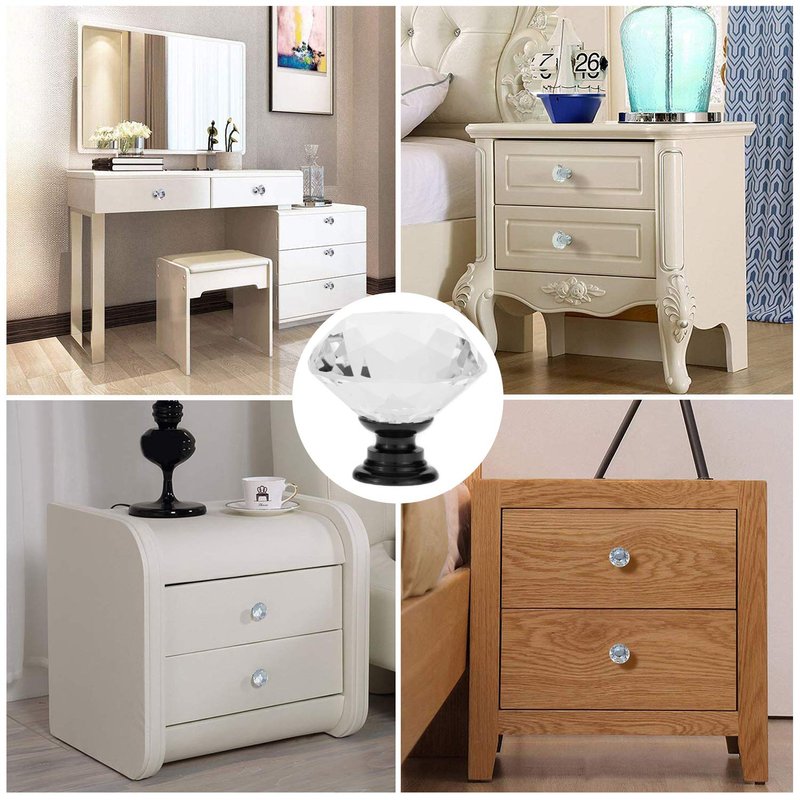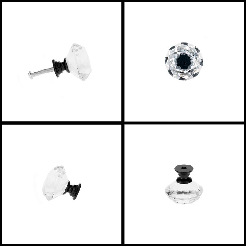D-buy 12 Pack 40mm Cabinet Knobs Drawer Pulls Drawer Knobs Dresser Knobs Diamond Shaped Crystal Glass with Screws (40mm, 12 Pack, Black) Specification: Material: Crystal glass and aluminum alloy Crystal diameter: Approx 40mm Base diameter: 19mm Total height: Approx 40mm Shape: diamond shaped Screws size: 4*25mm; Suitable for thickness from 0.57 inch to 0.78 inch Color: Black Easy Installation: Find the position where you want to install on the board and drill a hole. Then pass through the screw from the back of board and thread tight to the knob. Application: The crystal knob is very pretty artistic and durable, Ideal for cabinet, dresser, drawers, cupboards, wardrobes, bookcase in your home, kitchen, bathroom, living-room, book-room, dorm and office. Best for decoration. Package Includes: 12 * Cabinet Knobs 12 * Screw