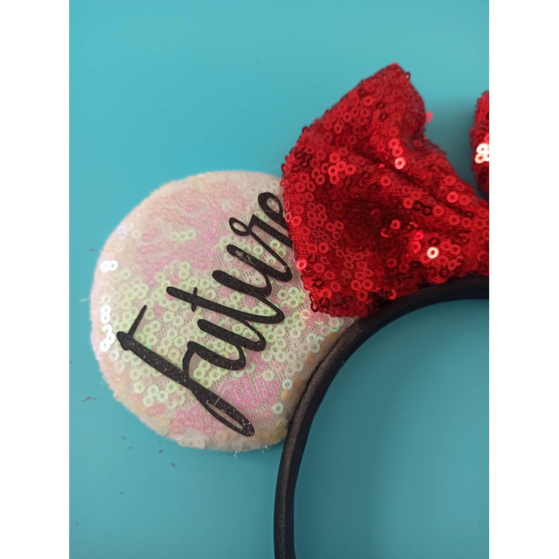 - Our Bride minnie ears headpiece is the perfect hens night and wedding accessory for the very special Bride. This elegant headband is made from Sequins and plastic.