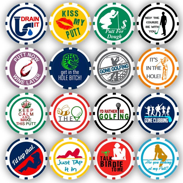 Make your golf outings more fun with these custom imprinted poker chip golf ball markers. Carry them in your pocket and give a few as gifts to your golf playing buddies. These ball markers are printed in our warehouse in the USA on heavy 11.5 gram clay composite poker chips. The high quality imprints are done on laminated vinyl decals that are then inlaid on the recessed surface of the chip, making them durable and water proof. Actual casino size chips. Makes for a fun and practical golf outing gift bag or charity fundraisers. Please note that the chips are shipped loose inside a sealed yellow envelope and do not have retail or gift box packaging.