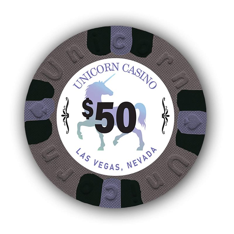 Play poker in style with professional grade Unicorn Casino all clay poker chips. The chips are made of real clay material for the true feel of real Las Vegas casino chips. Chips weigh 9 grams each which is the same as authentic casino chips. Las Vegas casino chips are typically weight between 7.5 to 9 grams and they are never any heavier as they do not have a metal insert like most other home chips on the market. These all clay chips do not use a metal insert which gives them the true click sound of a Las Vegas chip when splashed in the pot of shuffled. The clay material makes then non-slip, and they can be stack high without the fear of falling when sliding a stack across the table. The attractive Unicorn Casino design features easy to read denominations.