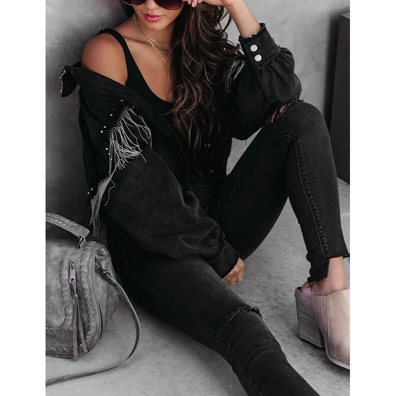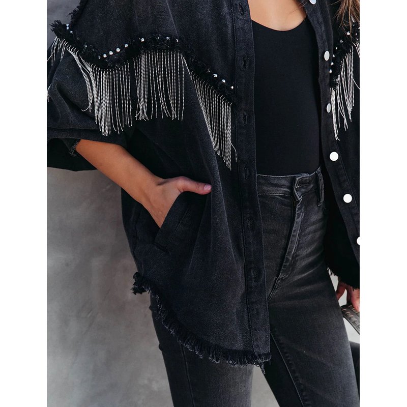 Daacee Casual Frayed Tassel Black Denim Jacket for Women Fashion Fringe Rhinestone Cowgirl Jean Coats(0191-Black-L)