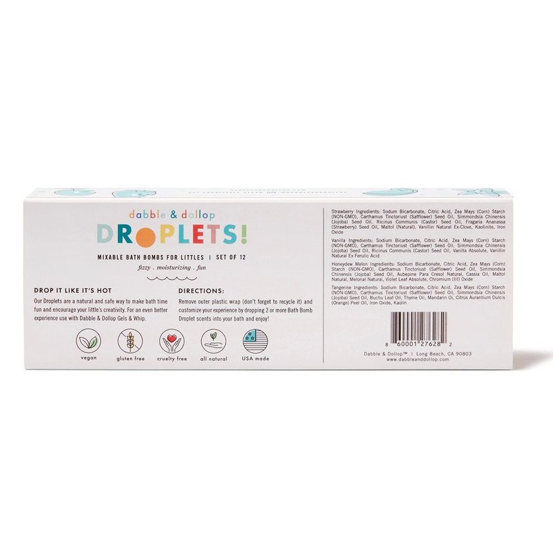 - KIDS CREATE THEIR OWN EXPERIENCES. Dabble & Dollop Droplets set includes 12 bath bombs in 4 fresh-smelling, all-natural scents and are designed for multiple bath bombs to be dropped in the tub and mixed so kids can create their own unique recipe combinations.