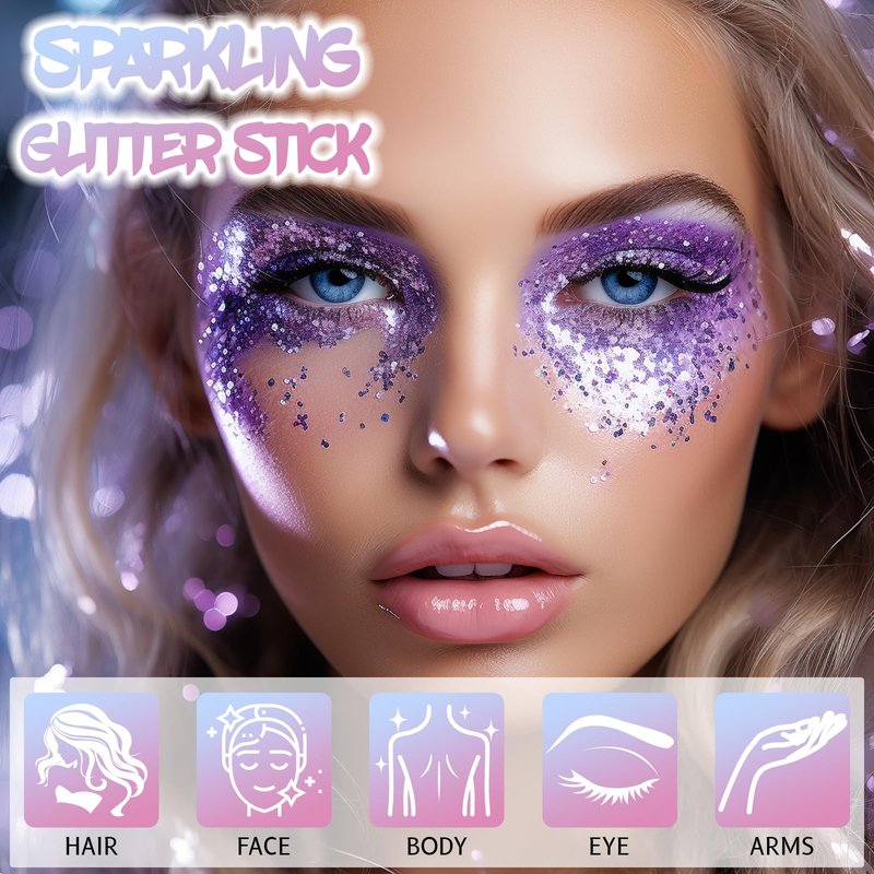 - Chunky Body Glitter: This body glitter stick with chunky sequins and delicate star sequins creates a visual effect like no other for you. Available in a variety of colorful shades, whether it's romantic pink or dazzling gold, it's easy to meet your individual needs and make your makeup instantly stand out and become the center of attention.
