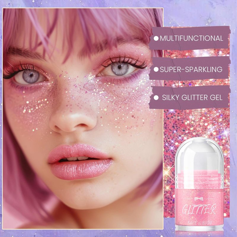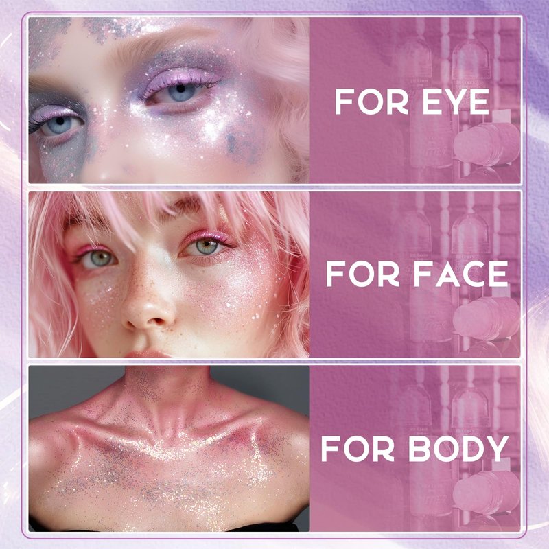 - WIDE APPLICATIONS --- Ultra fine glitter gel can be used to decorate face, eye shadow, hair, lips, collarbones, nails and more. This body glitter is very fine and smooth, dries quickly after application, adheres well to the skin and gives you a comfortable, natural glitter makeup.