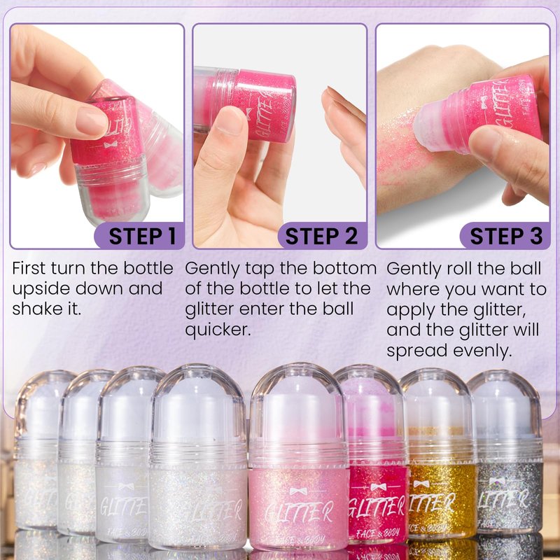 - ROLL-ON GLITTER GEL --- Unlike regular face glitter, the fine glitter has a rollerball design that eliminates the need for additional tools to apply the glitter. The large beads are designed to easily apply large swathes of glitter.As the ball rolls over your skin, you will feel a comfortable touch, giving you a great glittering experience.