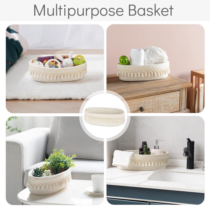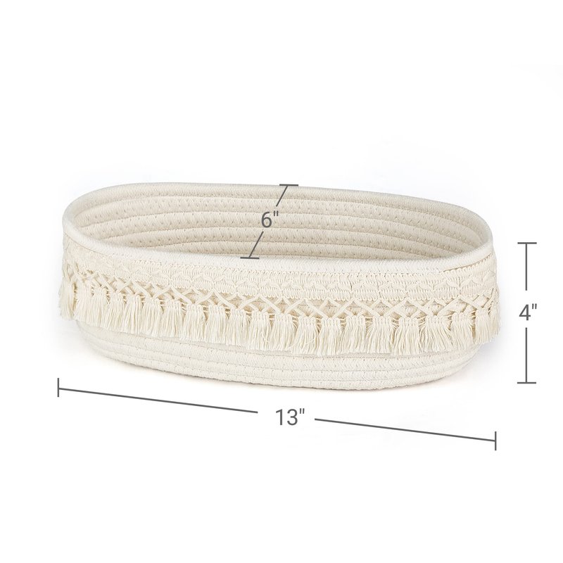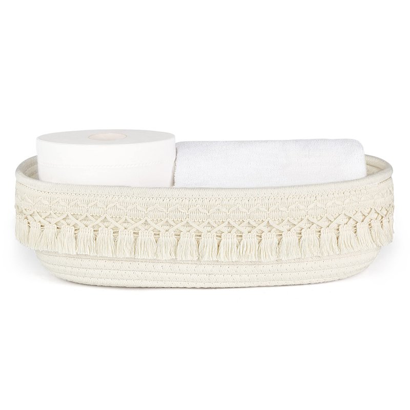 Dahey baskets not only can be used as a back of toilet storage basket in bathroom, it also can be used as a decorative basket to storage daily clutter on table or shelf in living room, bedroom, office, nursery. It will be make your place full of boho style.Material: Cotton rope Color: WhiteSize: 13"L x 6"W x 4"HPackage: 1 x woven storage basket