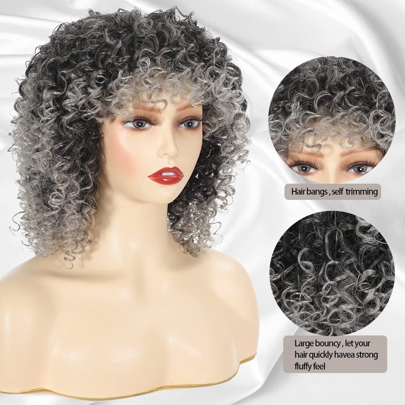 Daiaces Grey Ombre Curly Wig for Black Women Kinky Afro Curly Wigs with Bangs Hair Shoulder Length Ombre Grey Wig With Bangs Heat Resistant Synthetic Hair for Daily Use