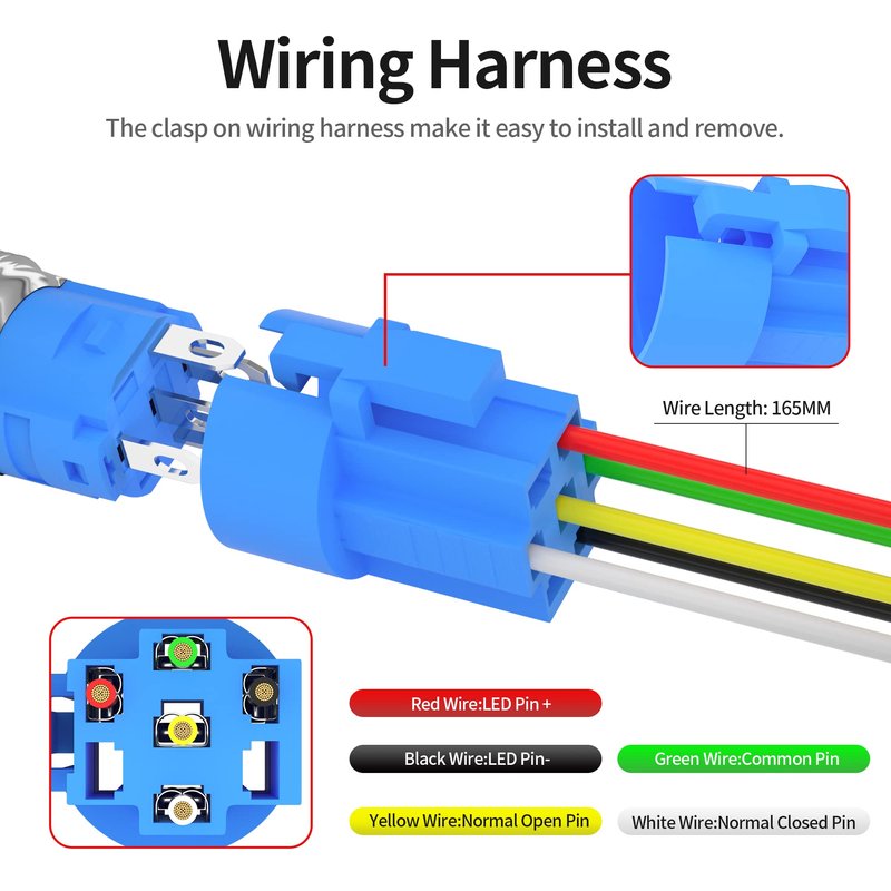 - Wire Harness: The package of the momentary push button switch 12v also contains suitable wire harness for this 16mm round air horn button, the clasp design of the wire harness make the wires easy to tidy as well as install and remove.