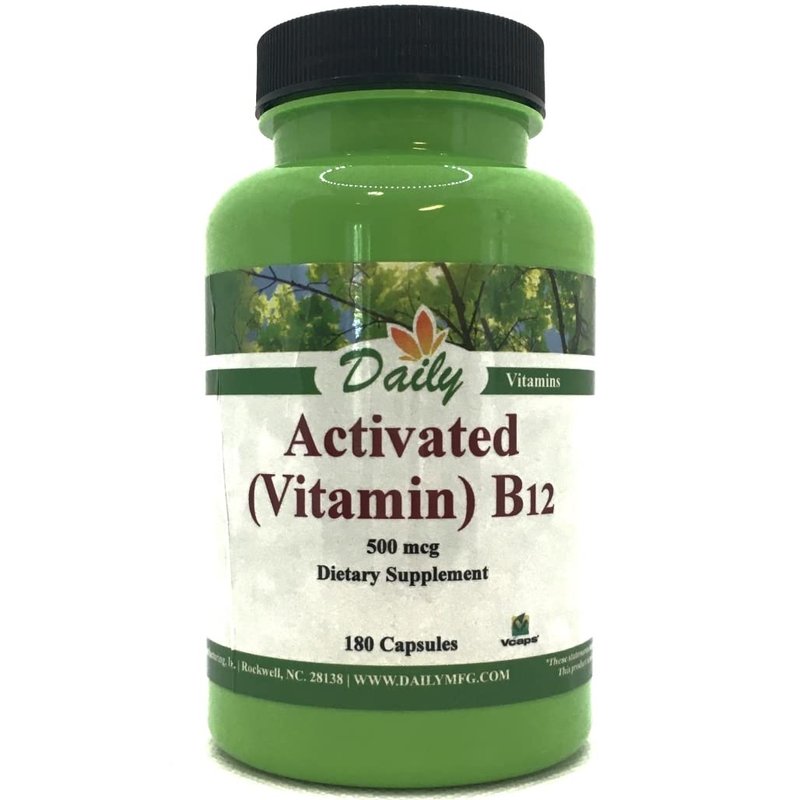 Daily's Activated B12 provides equal amounts of 5-deoxyadenosylcobalamin and methylcobalamin. These are the active forms of vitamin B12. For normal absorption, B12 requires intrinsic factor; but even without intrinsic factor, 1-2% of B-12 can be absorbed. One capsule provides Activated B12 500 mcg (considerably more than the RDA of 2mcg should be absorbed by anyone taking it). (cellulose, stearic acid, Gluten Free, Soy Free, Vegan) 180 Vegetarian capsules per bottle. *Please note: Due to supply chain limitations some products may arrive in white bottles instead of green bottles.
