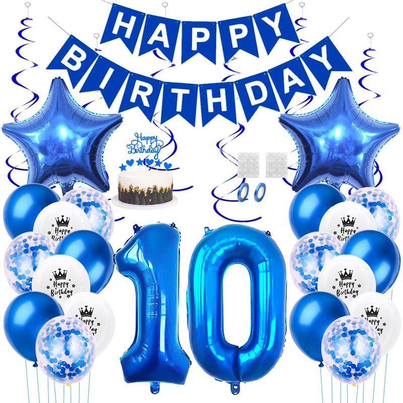 Daimay 10th Birthday Party Decorations Blue Happy Birthday Banner Flag Latex Confetti Balloons Number 10 Foil Balloon Star Mylar Balloons Cake Topper for Men Women Anniversary Party Supplies
