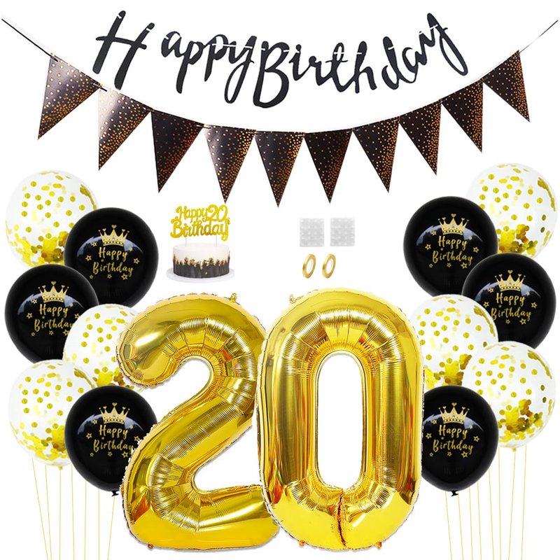 Daimay 20th Birthday Party Decorations Gold Black Happy Birthday Latex Confetti Balloons Triangle Flag Banner Number 20 Foil Balloon Cake Topper for Men Women Anniversary Birthday Party Supplies