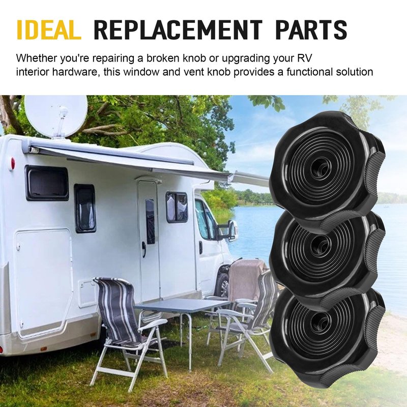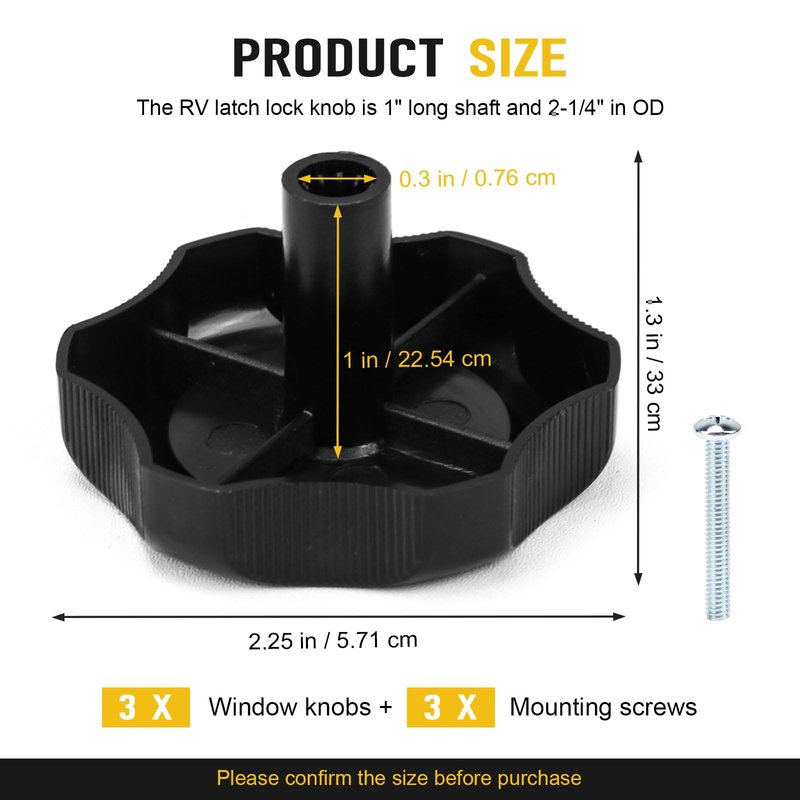 - Package - Our window and vent hardware set include 3 x black window knobs come with 3 x mounting screws, 1" Shaft and 2-1/4" Diameter. With its sleek and functional design, this knob not only improves the functionality of your RV windows and vents but also enhances the overall look of your RV interior.