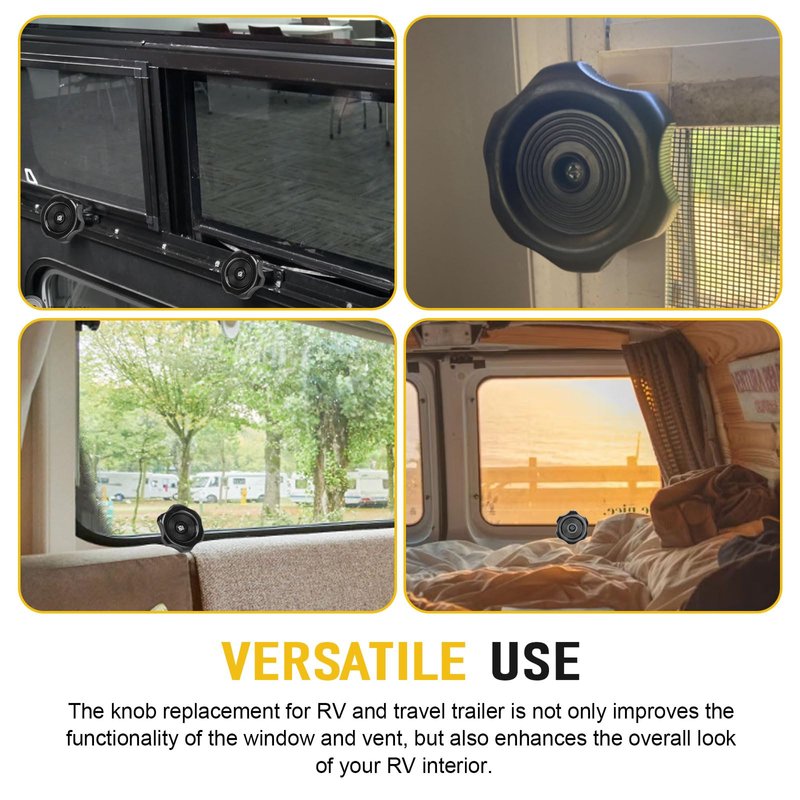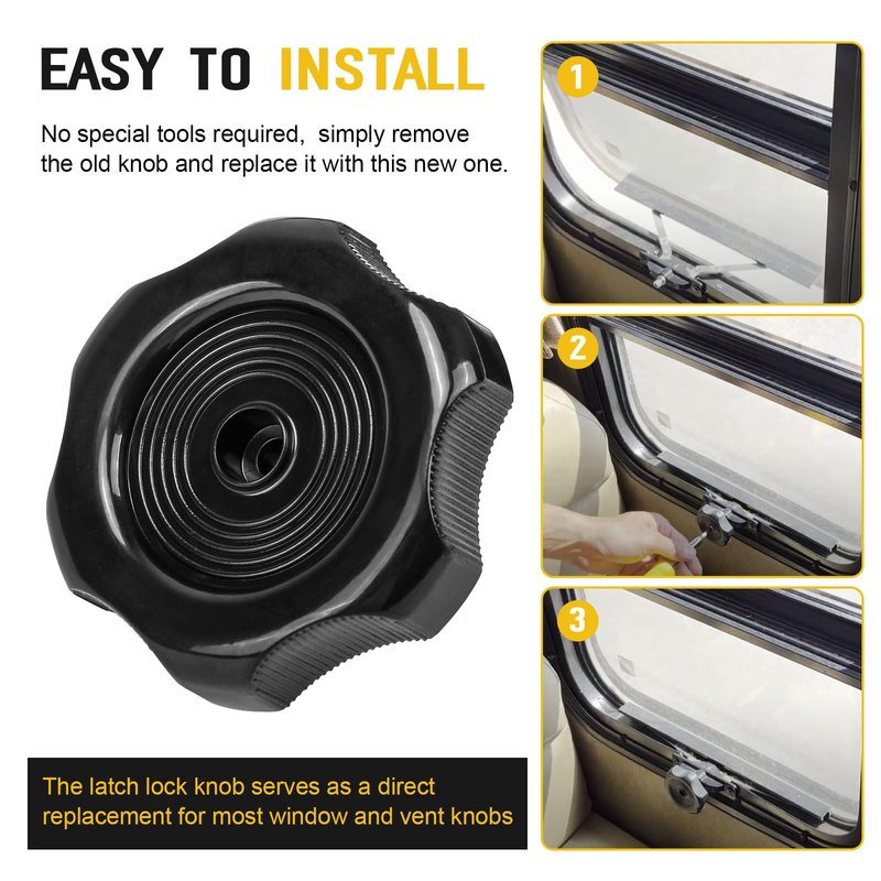 - Easy to Install - The latch lock knob for RV window crank handle or camper roof vent is direct replacement for most window and vent knobs, no special tools required, simply remove the old knob and replace it with this new one. The straightforward installation process ensures you can get back on the road quickly without any hassle.