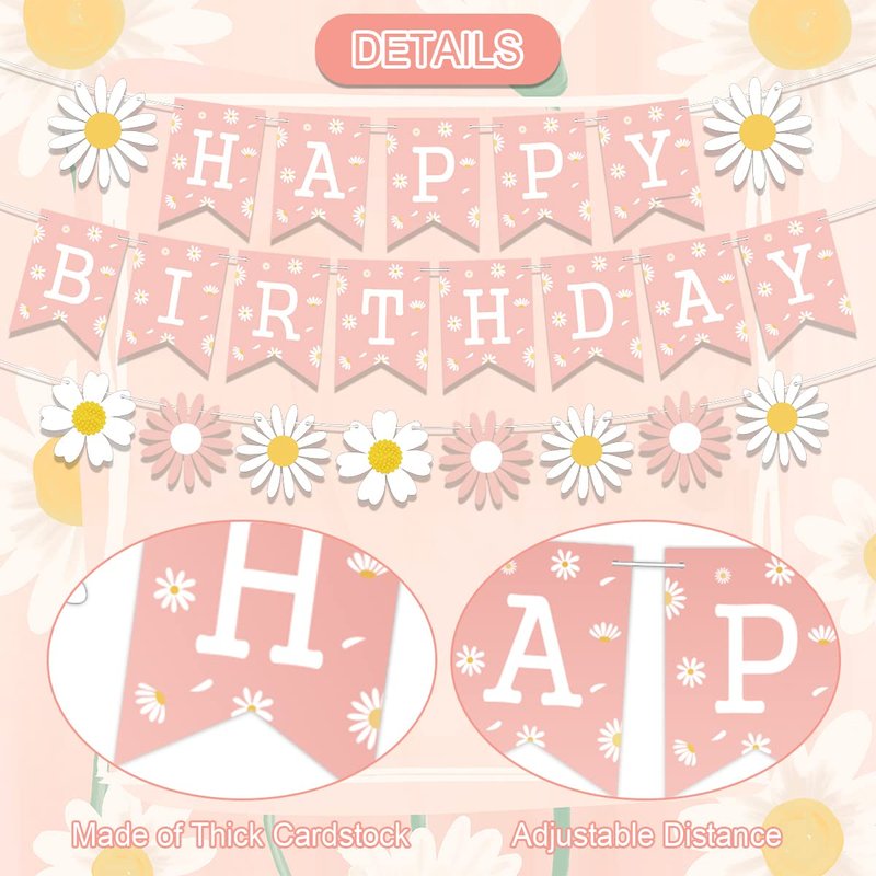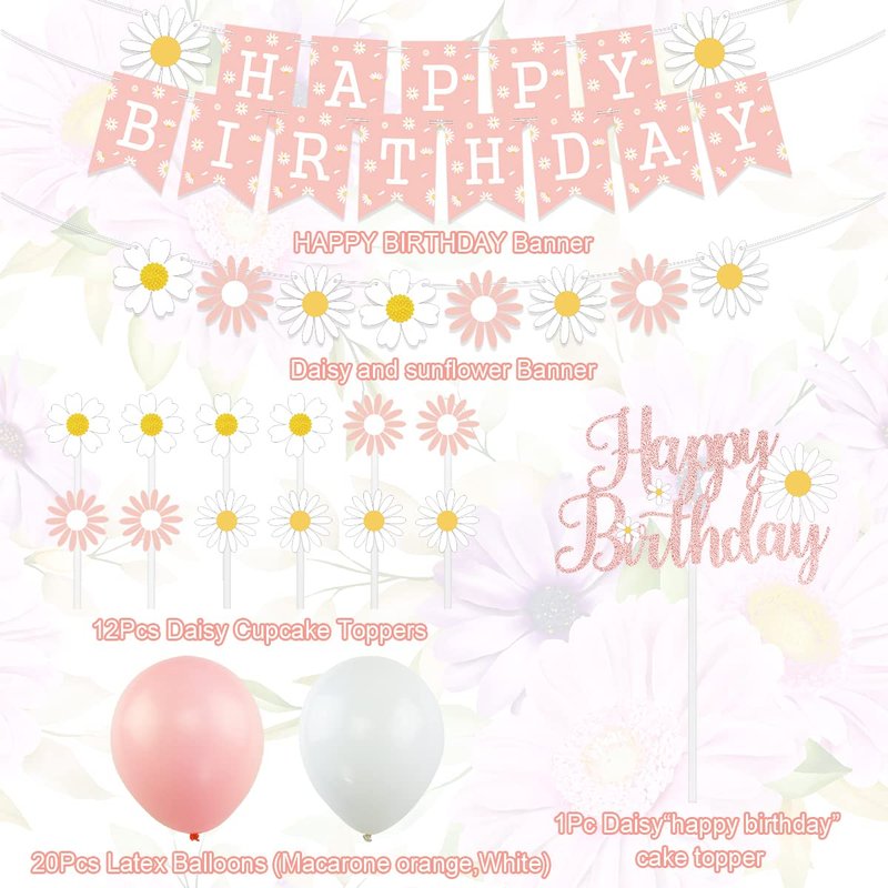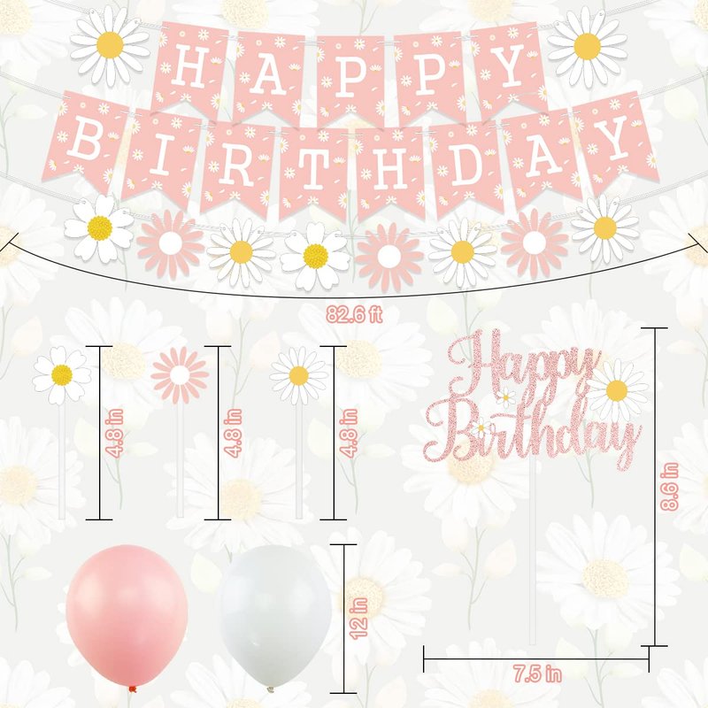 - Pre-Assembled and Easy Decoration : The daisy happy birthday banner was already assembrated, save your time when you decorate your party, The happy birthday cake topper and 12pcs small cupcake topper are pre paste well, No need to assemble, which save your time for use,the balloons are easy to assemble,all you need to do is to blow up the balloons(use a pump would be faster). You can put them on the string or use a double-sided tape to stick them to anywhere you want