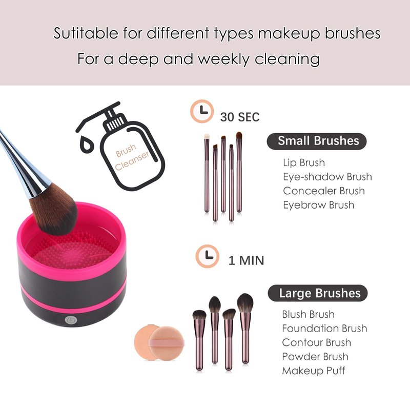 - Our automatic silicone spin cleaning bowl fits most size of makeup brushes and puff.