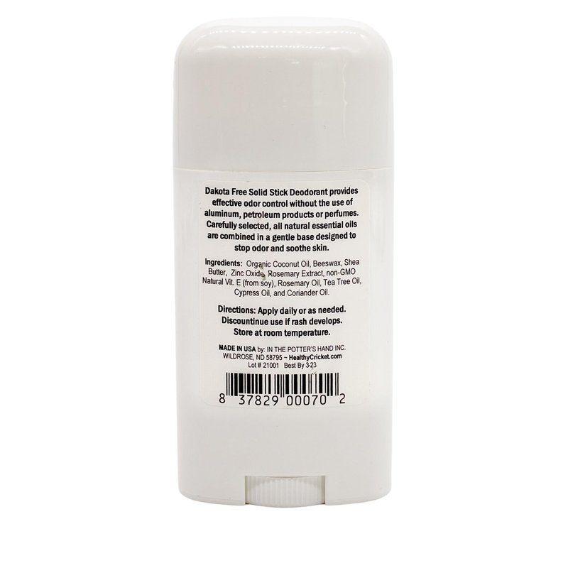 An effective and healthy alternative to commercial deodorants. Dakota Free Solid Stick Deodorant is designed for health and for sensitive skin; it does not contain aluminum, perfumes, parabens, phthalates, or propylene glycol. This product does contains a high percentage of organic ingredients and all-natural essential oils combined in a gentle base to stop odor and soothe sensitive skin. There are no perfumes or synthetic fragrances used. The natural essential oils and pure ingredients used give this product a slightly spicy aroma. Comes in a convenient wind-up tube; this is not an antiperspirant, it is a deodorant. This deodorant is ideal for bird watchers, bow hunters, sportsman and outdoor enthusiasts of all types; use in any situation where you want to blend in with the natural surroundings. Since it is made of natural, non-flower plant oils, there is nothing to attract attention from insects or animals. Ingredients: Organic coconut oil, North Dakota beeswax, shea butter, tea tree essential oil, zinc oxide (a natural mineral), rosemary extract, non-GMO natural Vitamin E (from soy), rosemary essential oil, natural cypress essential oil, and coriander essential oil.