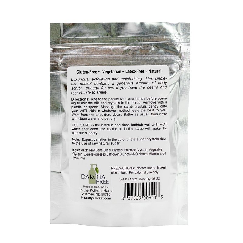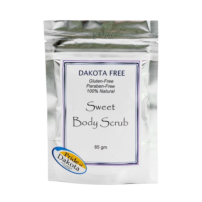 Sweet Body Scrub is a luxurious, exfoliating and moisturizing body scrub contains natural sugars, emollients and vitamin E. It will polish your skin while it helps you look and feel your very best. This product has been designed to pamper your skin royally. It is a pure pleasure on your skin and simple to use. Use tips: -Exfoliates, increases circulation and feels great on your skin all over. -Try on dry elbows and knees. -Treat yourself to a full body soak. -Moisturizes the skin while it polishes. Single use packet contains a generous amount - enough for two if you have the desire and opportunity to share. Precautions: Not for use on broken skin. For external use only. Note: Expect variation in the color of the sugar crystals due to the use of raw, natural sugars. Dakota Free Products takes the integrity of our products seriously and track the allergen status of our ingredients so that you can use the products with confidence. Ingredients: Raw sugar, fructose crystals (from corn), vegetable glycerin (from palm), expeller-pressed safflower oil, and non-GMO Vitamin E (from soy).