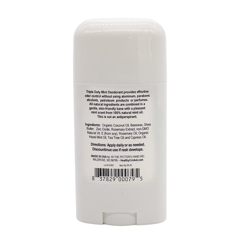 An effective and healthy alternative to commercial deodorants. Dakota Free Triple Duty Deodorant is designed for health and for sensitive skin; it does not contain aluminum, perfumes, parabens, phthalates, or propylene glycol. This product does contains a high percentage of organic ingredients and all-natural essential oils combined in a gentle base to stop odor and soothe sensitive skin. There are no perfumes or synthetic fragrances used. This solid stick deodorant is similar to our original formula, the presence of organic hazel mint oil give it a pleasant minty scent. It provides effective deodorant protection for any one of any age. Comes in a convenient wind-up tube; this is not an antiperspirant, it is a deodorant. This deodorant is ideal for bird watchers, bow hunters, sportsman and outdoor enthusiasts of all types; use in any situation where you want to blend in with the natural surroundings. Since it is made of natural, non-flower plant oils, there is nothing to attract attention from insects or animals. Apply after bathing, daily or as often as desired. Ingredients: Organic coconut oil, North Dakota beeswax, shea butter, zinc oxide (a natural mineral), rosemary extract, non-GMO natural vitamin E oil (from soybean), rosemary essential oil, organic hazelmint essential oil, tea tree essential oil and cypress essential oil.