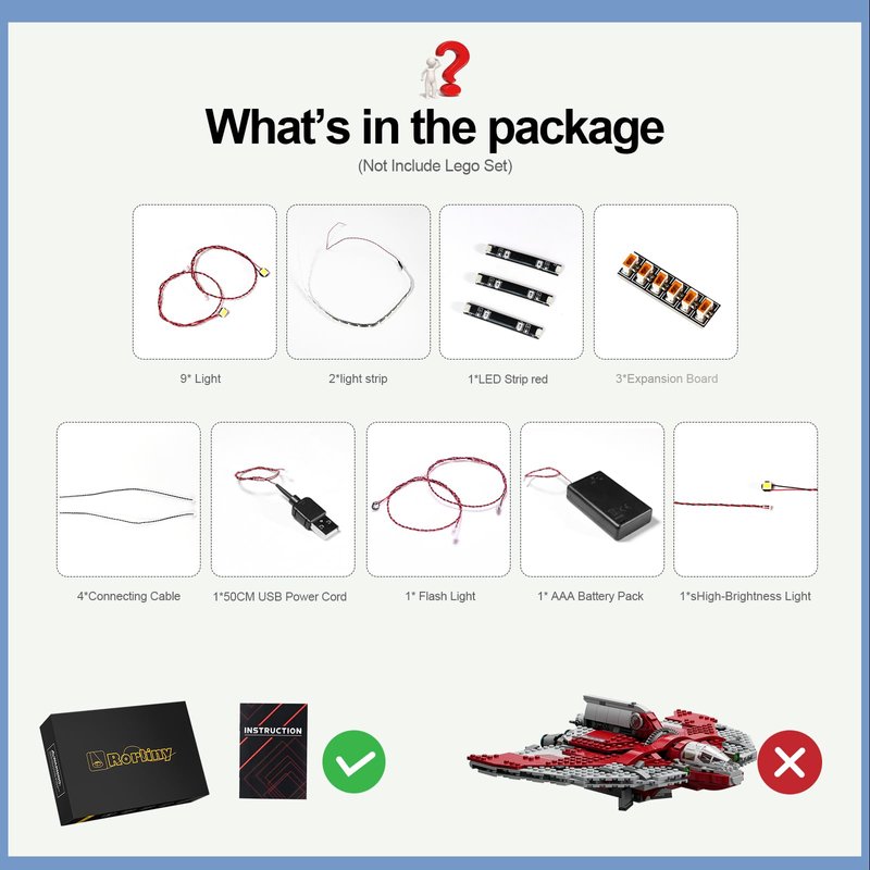 - 💎 [Exquisite Craftsmanship] This light is made of safe, reliable and environmentally friendly materials, each light uses the latest technology to illuminate every detail of the LEGO 75362 Star Wars Ahsoka Tano's T-6 Jedi Shuttle different lights, so that the LEGO block model set presents the best display effect.