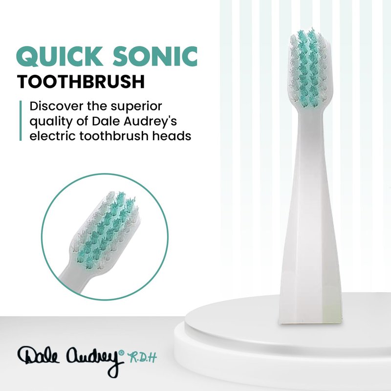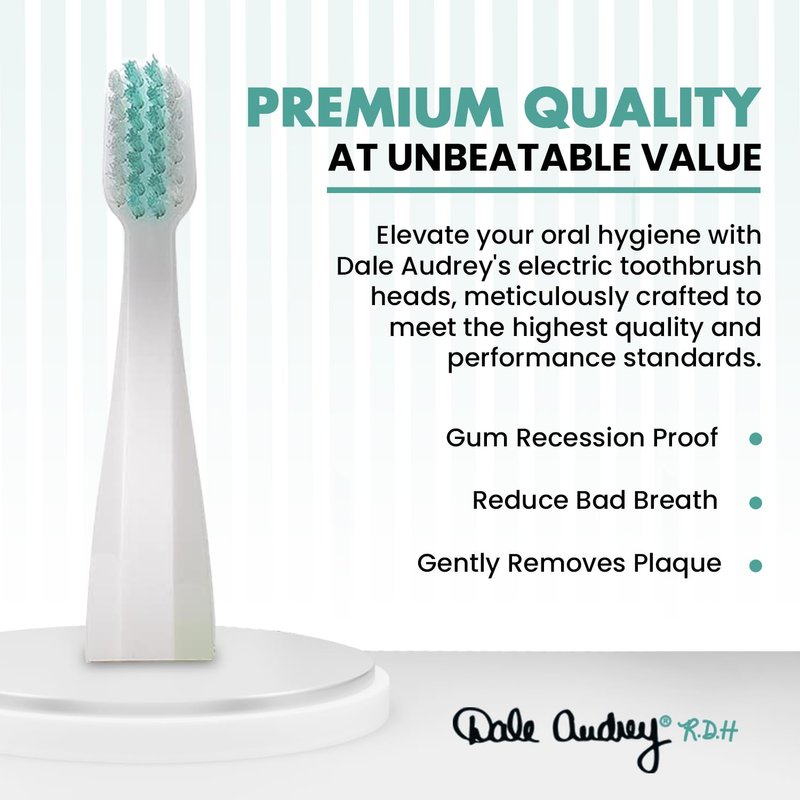 Dale Audrey's toothbrush replacement heads, you can achieve a thorough and gentle clean every time. The ultra-soft bristles, made of high-quality, glide along your teeth and gums, providing a comfortable brushing experience without compromising on efficacy. These bristles are designed to flex and adapt to the unique contours of your mouth, reaching even the hard-to-reach areas for effective plaque removal and a minimization of gingivitis.Upgrade your oral care routine with Dale Audrey's toothbrush head replacements and experience the perfect balance of comfort, efficiency, and value.