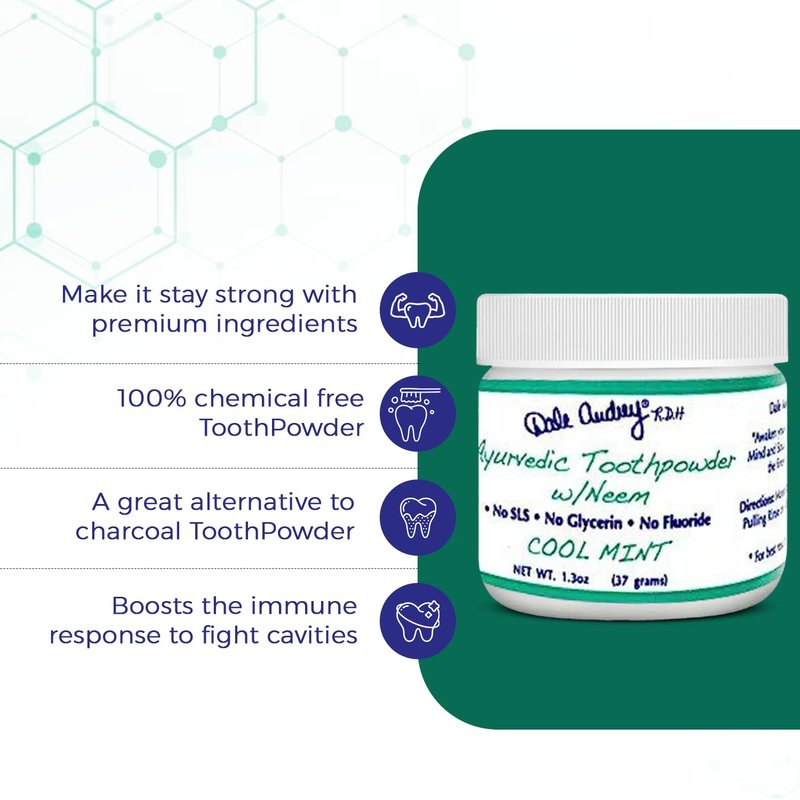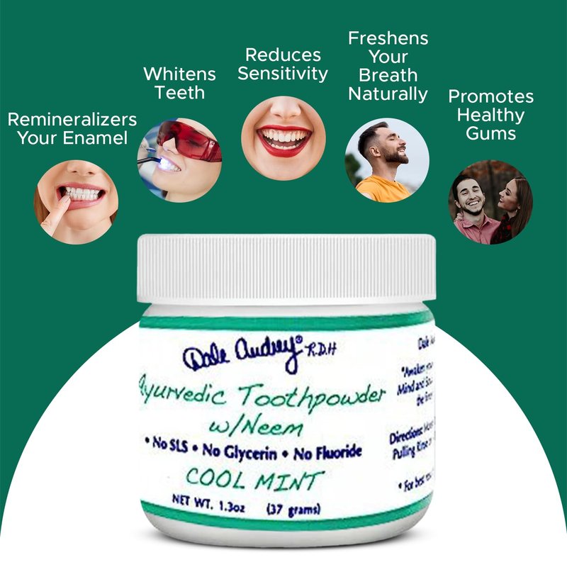 Dale Audrey Ayurvedic has captured the essence of oral care, combining natural ingredients with innovative formulations to revolutionize your dental routine . Ayurvedic Tooth Powder w/neem is unique. Artisan blended with love and passion, professionally formulated with over many years clinical dental hygiene experience.Dale Audrey Toothpowder is the go-to choice for those seeking a superior dental experience. This premium tooth powder provides a refreshing and invigorating sensation, leaving your mouth feeling clean and revitalized after every use. Our toothpowder is free from harsh chemicals, artificial additives, and synthetic foaming agents, ensuring a gentle and safe brushing experience.By using Dale Audrey Toothpowder, you're not only prioritising your oral health but also contributing to a more sustainable, and eco-friendly lifestyle . With its fine texture and effective cleaning action, Dale Audrey Toothpowder effortlessly cleans teeth, stains, and discoloration from your teeth, revealing a radiant and confident smile. Experience the power of Dale Audrey R.D.H. ,products through over 40 plus years of clinical dental hygiene experience for optimum oral care Our product is vegan, gluten-free, non-GMO.