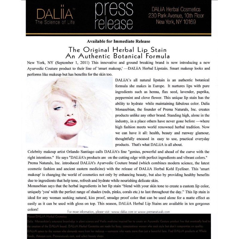 Thanks to the introduction of DALiiA Herbal Lip Stain, there is a better lip-dressing option that won’t budge. DALiiA’s formula is called The Original Herbal Lip Stain, because it is authentic—it contains only plant ingredients that were used throughout history, from ancient Greece and India to Elizabethan England. It’s a completely botanical must have for long lasting color. Now you can have the perfect lip color that lasts throughout the day. Celebrity makeup artist Orlando Santiago calls DALiiA's line "genius, powerful and ahead of the curve with the right intentions." He says "DALiiA's products are on the cutting edge with perfect ingredients and vibrant colors." Flax seed oil and Wheat Protein help to gently moisturize the lips while the Paprika, Clove Flower, Lavender and Peppermint extracts work their magic to create a matte pigment. Floral, fruit and other natural plant aroma extracts give you a full experience of what it feels like to color your skin with natures’ best kept secrets. Due to the herbal ingredients that blend with your skin, DALiiA Lip Stain creates a subtly customized lip color, uniquely you, in a wide range of shades! NOTE: Do not apply lip gloss or balm before using DALiiA lip stain because the pen applicator tip can get clogged by waxes and oils. Gloss or lip balm may be applied after if desired (after color settles on skin). This pen is similar to a magic marker - it will dry if cap is left off for long periods of time. Keep caps on when the product is not in use to avoid drying out. Avoid use if lips are cracked and dry.
