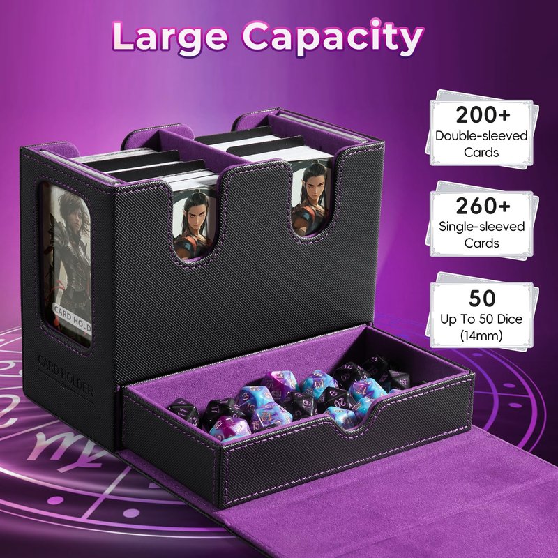 - ๐๐ซ๐๐๐ข๐ง๐ ๐๐๐ซ๐ ๐๐ญ๐จ๐ซ๐๐ ๐ ๐๐จ๐ฑ:Deck boxes cards holds 200 double-sleeved cards and tokens or 260 single-sleeved cards,includes a drawer for dice (up to 50 dice (14mm))for mtg deck boxes commander,measures 6.7X3.9X5.6 inch,comes with 4pcs card splitter,2pcs top loader card storage.