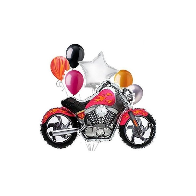 DalvayDelights 8pc Pieces Pink Motorcycle with Orange-Yellow Flames Mylar and Latex Balloon Bouquet Set