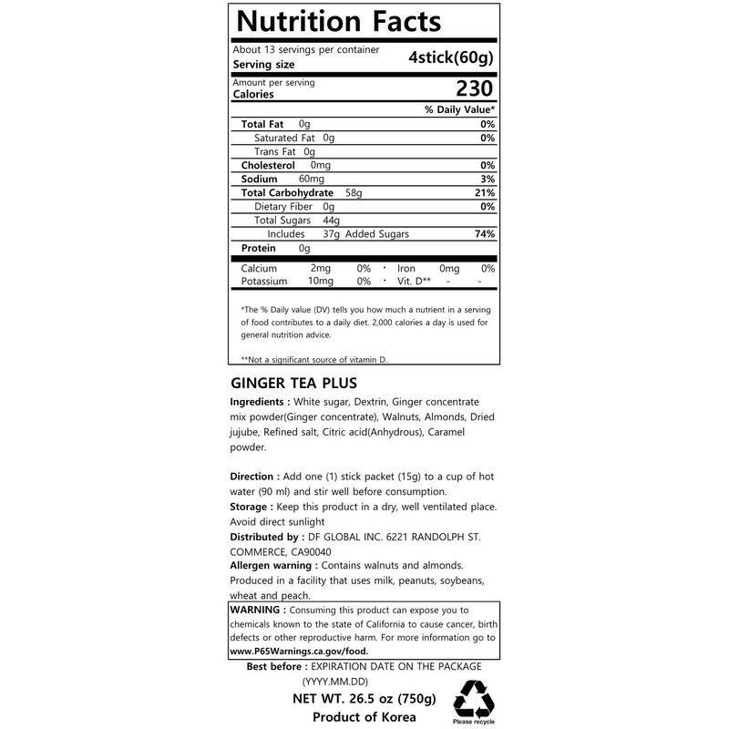 Damtuh Korean Traditional Ginger Tea Plus, Ginger Powder, 15g x 50 Sticks