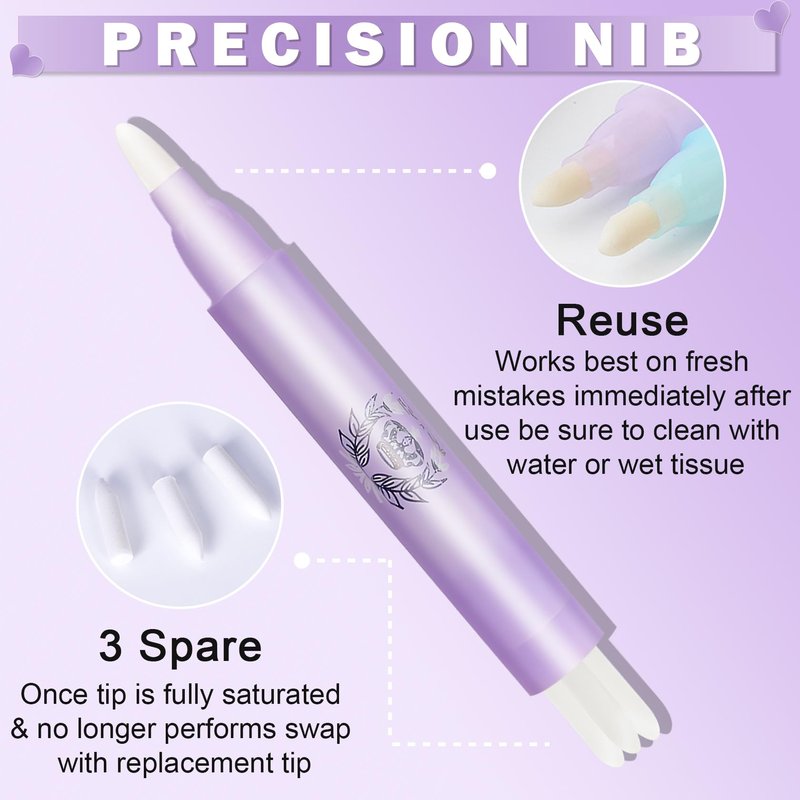 2.3-in-1 makeup remover pen,can be used as a makeup remover to easily remove mascara stains; as a correction fluid to repair lip lines,sharpen eyeliner or outline eyebrows;as a manicure tool to correct the edges of painted nails.