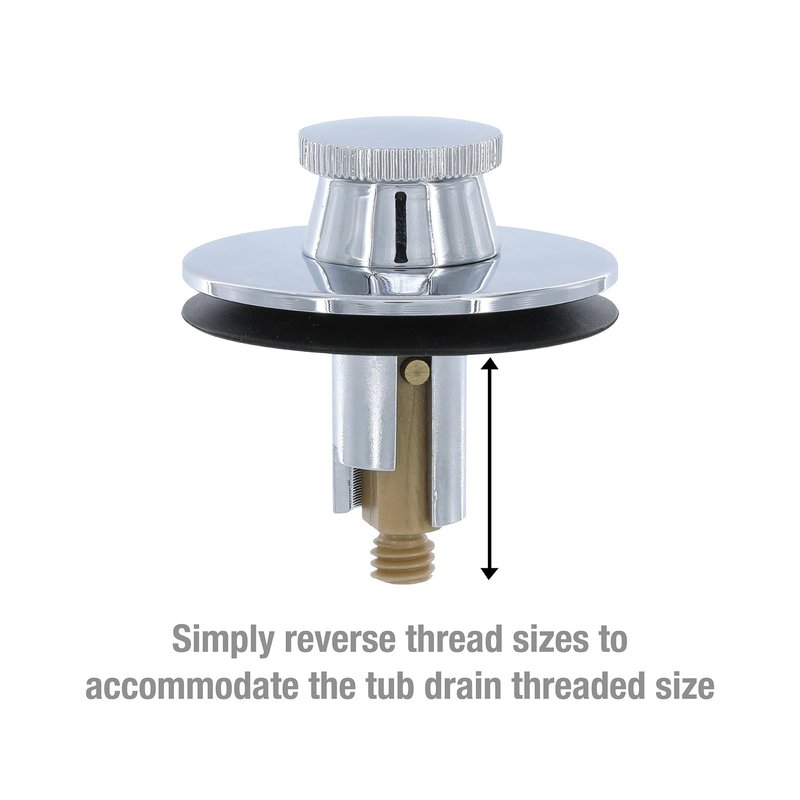 - VERSATILE FIT: This tub drain stopper has two thread sizes: 5/16 in. on the bottom end and 3/8 in. underneath the stopper. The thread sizes can be reversed to accommodate the tub drain threaded size.