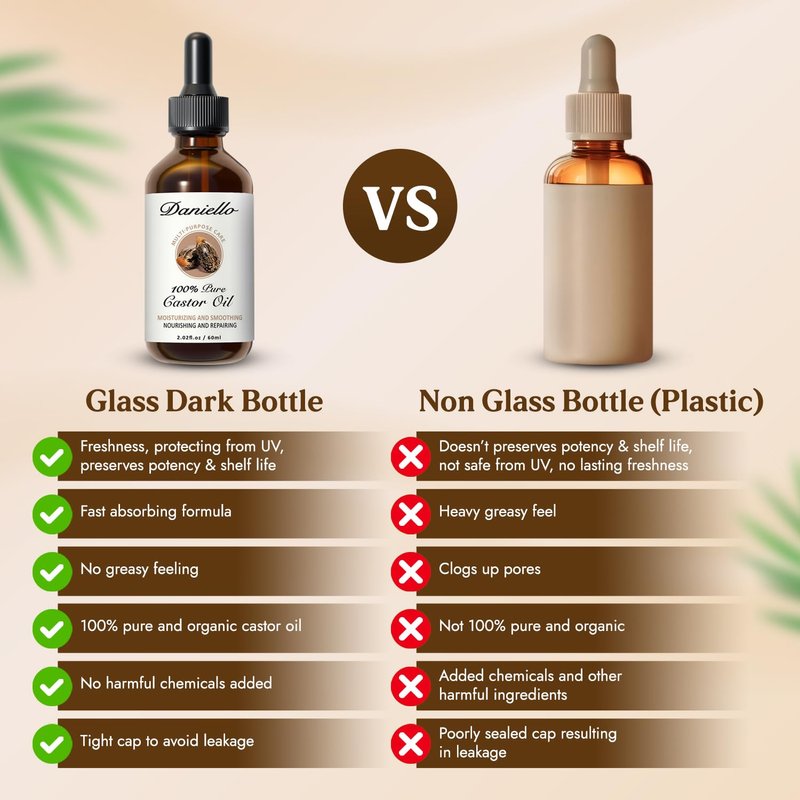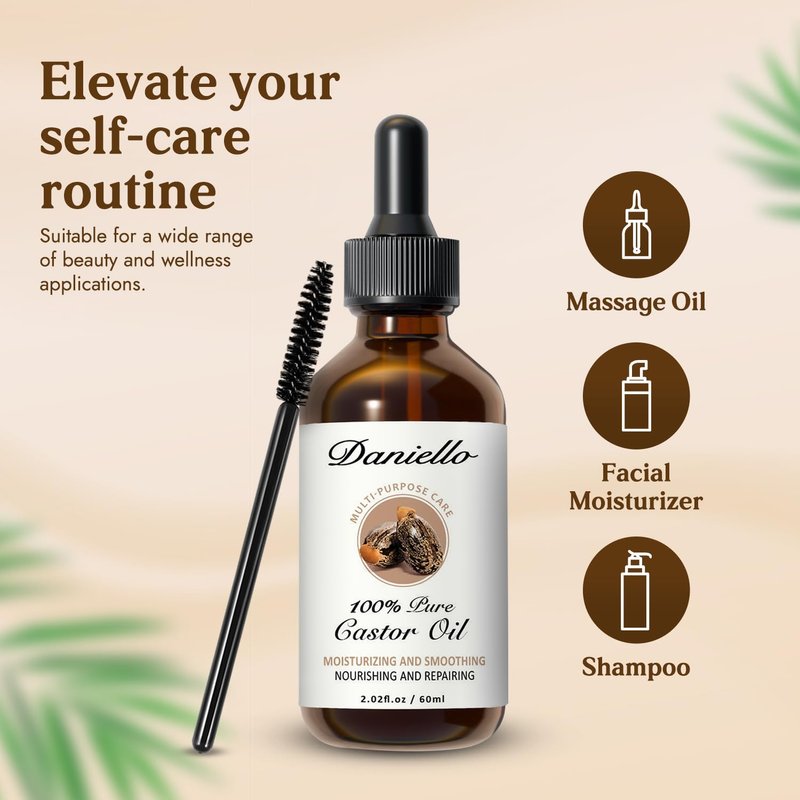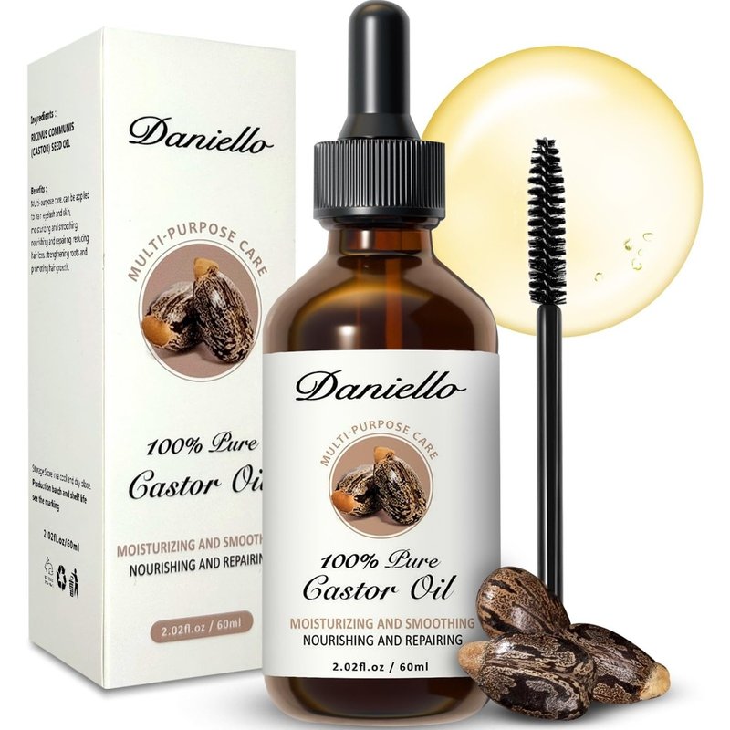 Daniello 100% Pure, Organic Castor Oil, Cold Pressed (2oz) Hexane Free in Glass Bottle. Fast Absorbing, for Hair, Eyebrows, Eyelashes, Nails and Beards. Stimulates Growth and Natural Skin Moisturizer