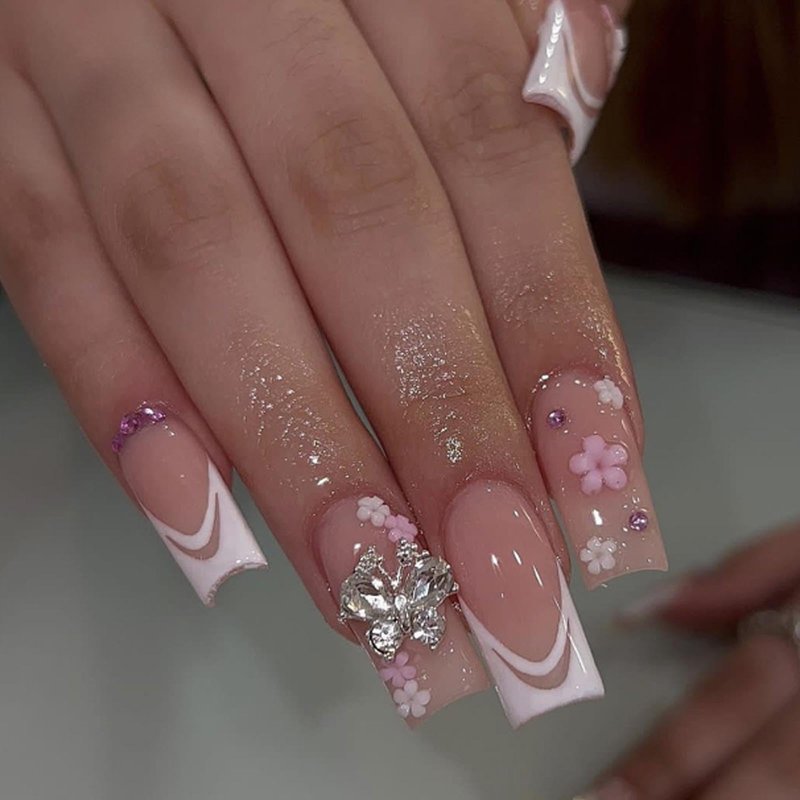 DANMANR French Fake Flower Nails Square False Nails Full Cover Butterfly Acrylic Shiny Fake Nails for Women and Girls 24PCS